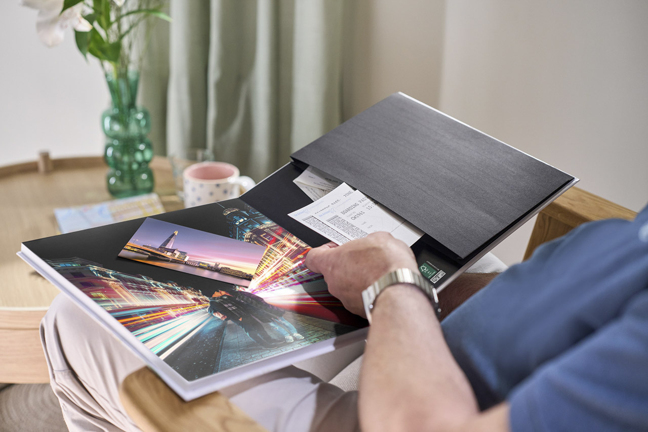 The CEWE PHOTOBOOK with a memory compartment is a personalized photo album designed to preserve photographs and meaningful keepsakes in one place. Users can customize the book with their own images, layouts, and text, turning personal moments such as holidays, weddings, or family events into a printed narrative. A special Memento Pocket can be added in black or white (to match the color of the End Pages) to store small items like tickets, notes, or souvenirs, allowing physical mementos to accompany the photographs. The book is produced with high-quality printing and durable binding to ensure long-term preservation of memories. By combining images, text, and stored objects, the photo book functions as a lasting archive of personal experiences.